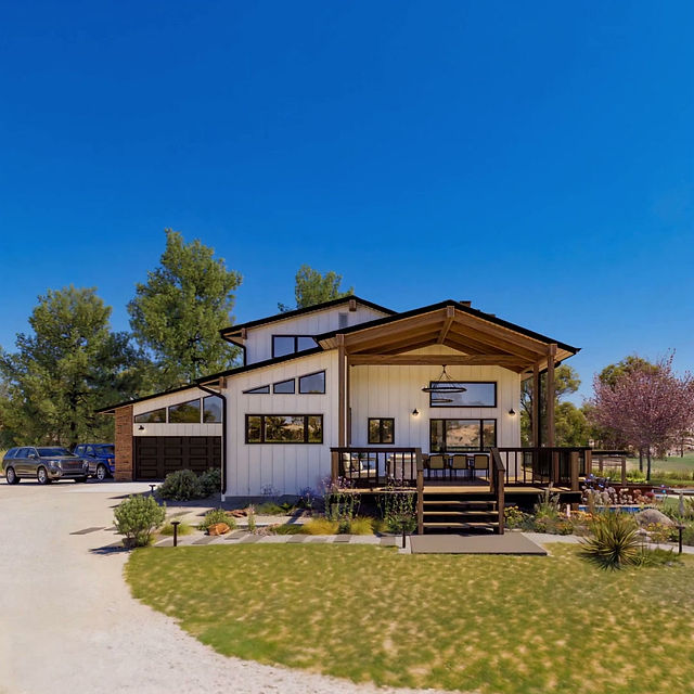 A cohesive exterior transformation based on a consistent vertical board-and-batten siding (12" spacing with 2" battens), applied across the entire house to unify the architecture.